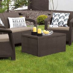 Corfu box - это элегантный мебельный гарнитур с фактурой, напоминающей ротанг, который состоит из двух кресел, двухместного дивана и столика-сундука. Продукт оснащён мягкими подушками сидений. В столе-сундуке всегда можно спрятать вещи от дождя. Мебель с легкой и одновременно устойчивой конструкцией красиво впишется в любое приусадебное пространство, такое как сад или терраса. Набор очень легко чистится. Изготовлен из стойкого к воздействию УФ-излучения пластмассы.